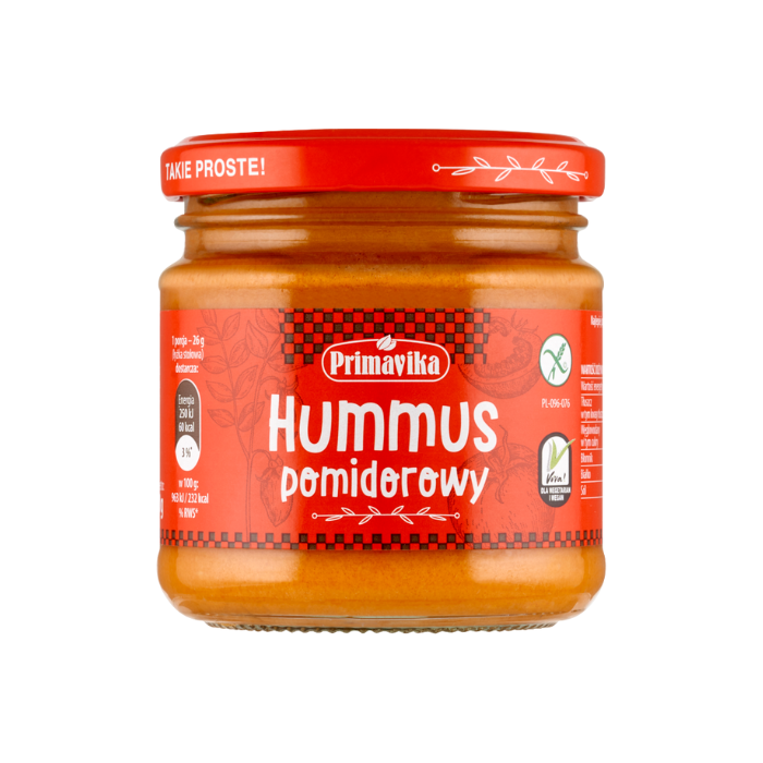 Hummus pomidorowy to propozycja dla wszystkich tych, którzy uwielbiają kuchnię roślinną w nowoczesnym wydaniu. Nasza orientalna pasta wyróżnia się doskonałym i wyrazistym smakiem, za który odpowiadają idealnie dobrane dodatki. Bazą receptury jest szczególnie popularna wśród wegan i wegetarian ciecierzyca, będąca skarbnicą cennych witamin z grupy B, a także wapnia, magnezu i białka, których jakość została zachowana dzięki procesowi pasteryzacji. Na liście składników nie zabrakło również miejsca dla mocno skoncentrowanych pomidorów, miazgi sezamowej, soku z cytryny oraz słodkiego akcentu w postaci syropu z agawy. Co więcej, hummus pomidorowy to produkt bezglutenowy, dzięki czemu z powodzeniem może zagościć w diecie osób, które cierpią z powodu alergii pokarmowej na zboża.                                                                                                                                                                                                                                                                                                                                                                                                                                                                                                   Choć wiele osób jest przekonanych, że hummus powstał w Libanie, do tej pory nie potwierdzono jednoznacznie jego pochodzenia. Istnieje bowiem spore prawdopodobieństwo, że kolebką smakołyku mogą być też Grecja, Izrael lub Syria.